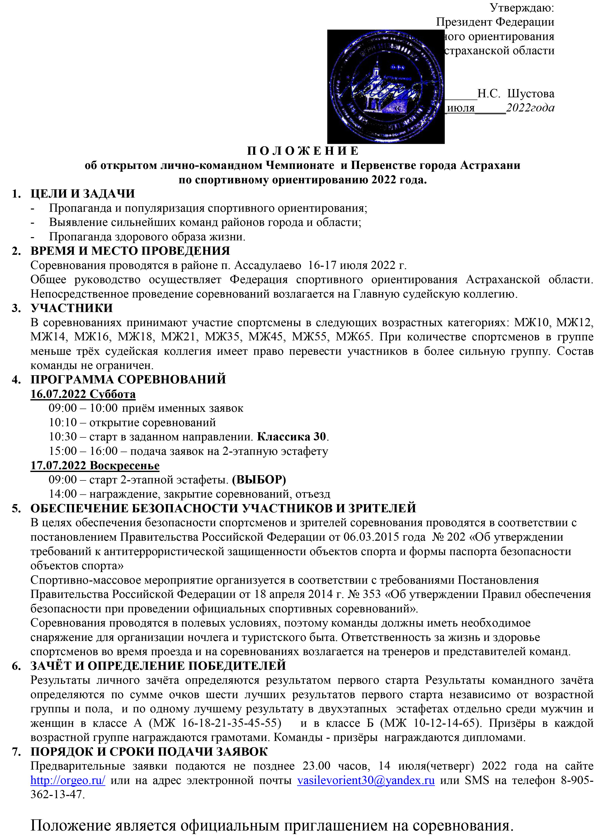 Предварительные заявки подаются не позднее 23.00 часов, 14 июля(четверг) 2022 года на сайте http://orgeo.ru/ или на адрес электронной почты vasilevorient30@yandex.ru или SMS на телефон 8-905-362-13-47.